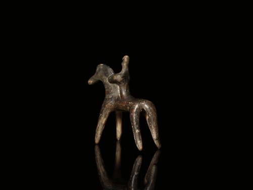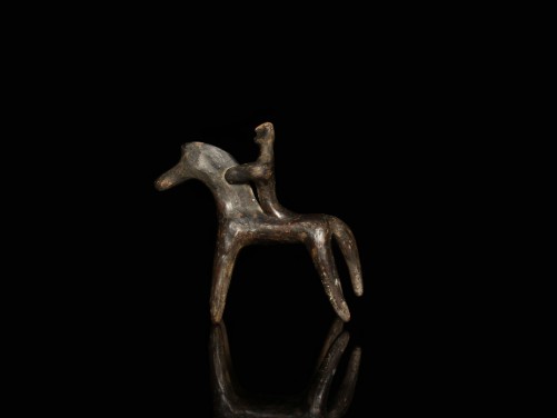 Boeotian black-glazed archaic horse, with cylindrical-like legs and body, the long neck with a protruding mane. The rider is clasping the mane with both hands and gazing forward. The re-attached pointed tail of the horse stands firm behind the hind legs completing the overall rigid appearance of the figurine.