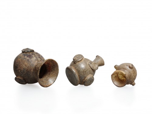 Dark-Olive green glass. Each of globular form with disc-shaped foot and applied circular medallions, an example with short splayed neck and flattened rim, and two with wide splayed neck and open mouth. (3)