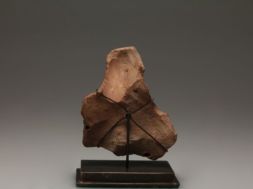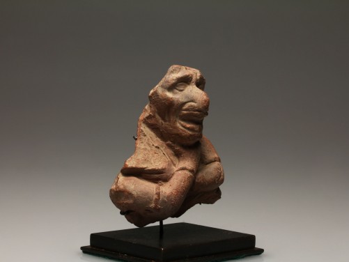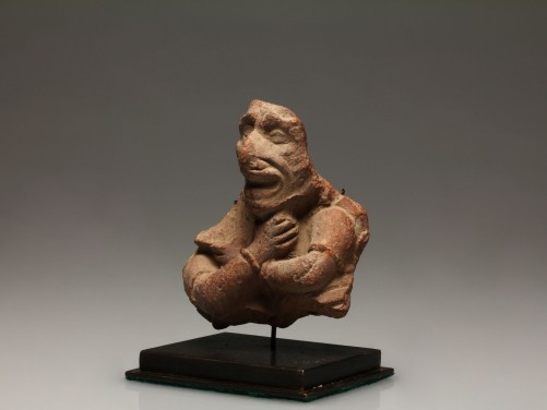 Of medium brick-red marl clay, the fragmented bust depicts an actor, with his right hand at his neck as though choking, large lips and wide open mouth, bulging nose , furrowed forehead, and decorated with armlets and bracelets. Mounted