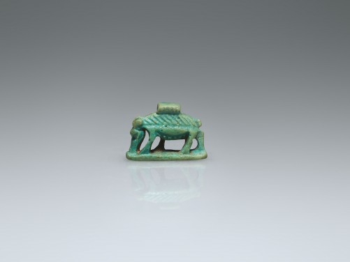 Green glazed faience composition amulet, depicting the sky-goddess Nut as a sow, with detailed markings on her body, left legs forward, her beak reaching to the base, and a suspension hole on her back.