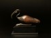 The finely modelled sacred bird of the moon god Thoth, depicted seated in recumbent form with his legs tucked beneath him, his gently curved ‘S’-shaped neck fronted by a long downturned beak, the eyes recessed for now-missing inlays, the tail feathers and leg markings carefully engraved, the beak incised along its curve, the body in two-tone brown on reddish patina, with four bronze tangs for attachment.