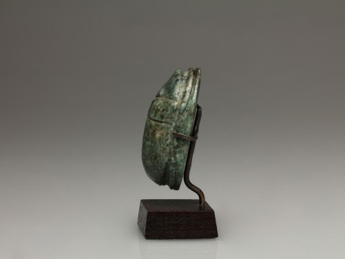 The well-polished olive-green feldspar scarab, naturalistically modelled with traces of gold-flakes to the surface, the base uninscribed. Mounted