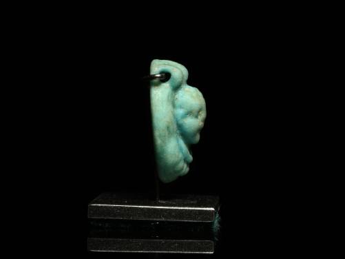 Green glazed faience composition amulet, in the form of a roundel, depicting the bust of Horus the child in the raised, wearing a broad beaded collar, a ribbed suspension loop above pierced through horizontally for suspension. Mounted