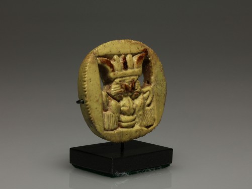 A yellow glazed openwork faience plaque amulet, depicting the stylized carved head of the Egyptian god Bes, wearing a crown of plumes, with traces of red pigment, pierced horizontally for suspension. Mounted