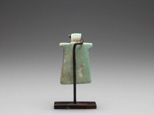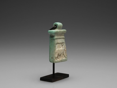 Pale blue glazed composition pectoral of the bull deity Apis, of pylon form, carved in relief with the bull wearing a sun disc, surmounted by a ridge, with a perforated suspension loop above. Mounted