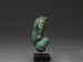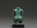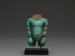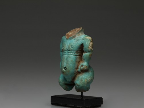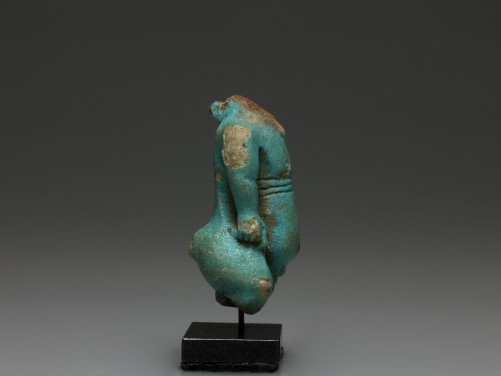 The fragmentary blue glazed faience composition amulet depicts the dwarf god Ptaichos, shown in his usual stance with hands resting on his hips, full belly and large backside. The nipples, muscular folds, belly button and phallus carefully accomplished, indicating that this figure may be the work of the New Kingdom. Mounted