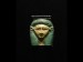 Of two-tone opaque green and yellow glass, depicting the central adornment from a sistrum, portraying the goddess Hathor in her typical appearance, with cowry ears and lappet wig, with flattened-top for the now missing naos shrine.