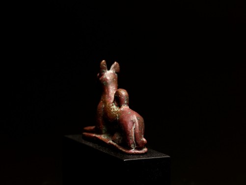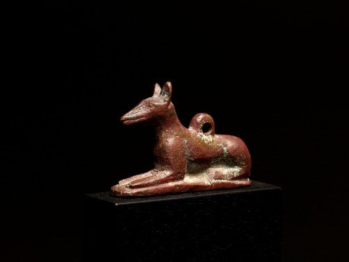 Of reddish patina, the elegantly depicted Anubis-jackal figure reclining with his forepaws out-stretched, erect ears, tail curved around his right side, the facial details well incised, on a raised plinth with a suspension loop at his back.