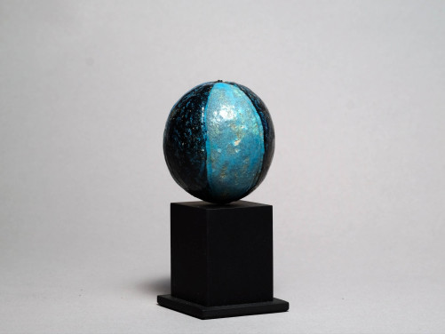 Bichrome glazed faience composition spherical bead of alternating turquoise and dark-blue pigment, pierced for suspension.