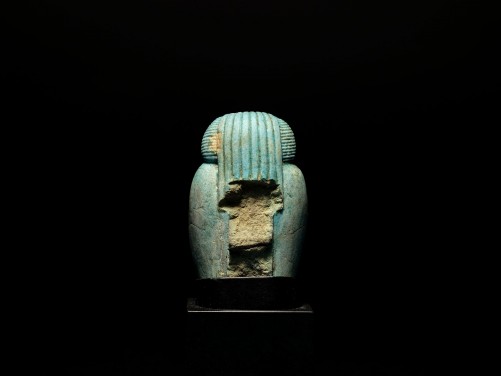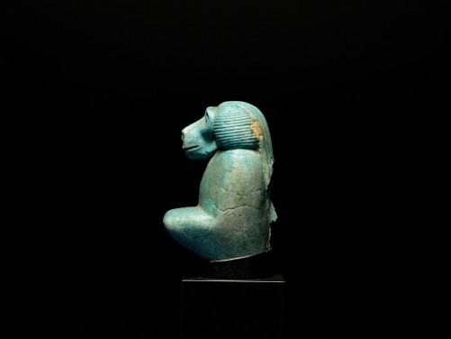 The blue glazed composition baboon-headed god, sacred to the moon god Thoth, depicted squatting, the elongated snout with finely incised mouth and nostrils, recessed eyes beneath prominent arched brows, and wearing a full mummiform garment, his cape-like mass of fur composed of echeloned vertically-striated lappets against a horizontally-striated ground on either side.