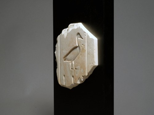 Fragmentary limestone column relief sculpted in sunk, depicting a standing pintail duck, translating to sa, ‘son of…’, with fragmentary inscription beneath, and traces of pigment preserved.