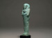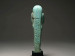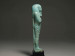 Standing on an integral plinth, depicted mummiform with the arms crossed at the chest, holding the pick, hoe, and seed-sack over his left shoulder, and wearing a braided beard and tripartite wig, inscribed with the shabti spell (Chapter VI Book of the Dead) in two vertical lines on the back and ten horizontal lines at the front with the titulary and parental affiliation, the full text reading: