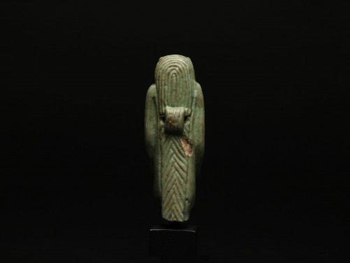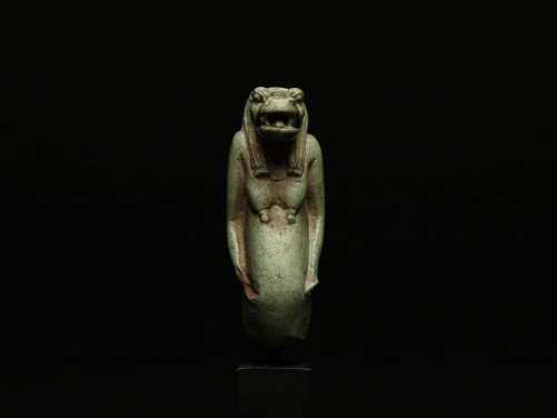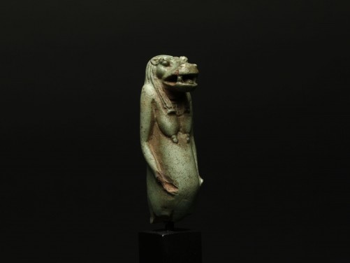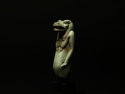 The goddess depicted with the combined elements of a hippopotamus, woman, and crocodile, standing with her arms held at the sides of her pregnant belly, with pendulous breasts, wearing a tripartite striated wig and collar, her wide openwork mouth baring teeth and tongue, a suspension loop at the back.