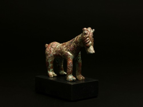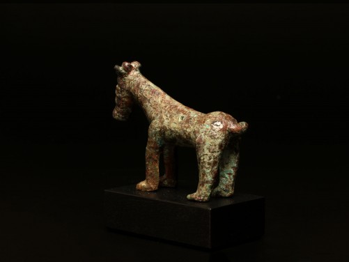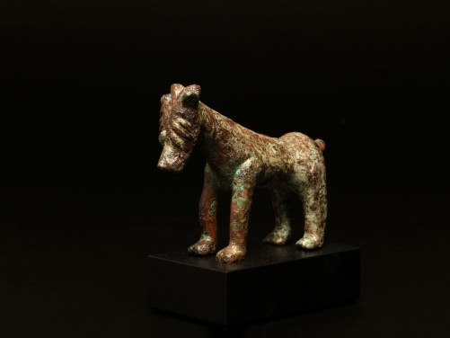 Hollow body, of naturalistically modelled dog-like form, perhaps a bull or zebu, standing foursquare, with short tail, short horns, bulging haunches and shoulder markings, the eyes and snout with incised markings.
