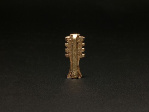Gold sheet djed pillar amulet, with traces of bitumen, representing the backbone of Osiris, symbolizing strength and stability. Carved in the shape of a tall shaft with 4 horizontal bars, the back side of the pillar stands a taller column, pierced for suspension.