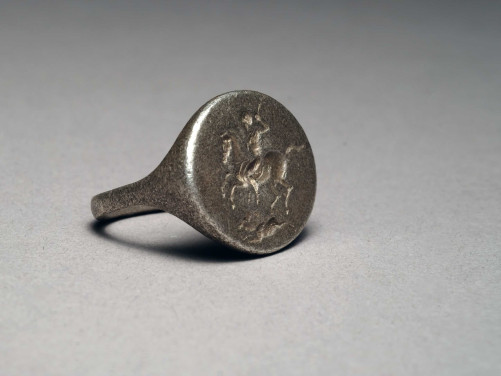 With a plain hoop, rounded on the interior, flat on the exterior, the oval bezel engraved with a hunter on horseback spearing a boar below. 27.06 mm. 19.98 mm internal. 14.46 grams.