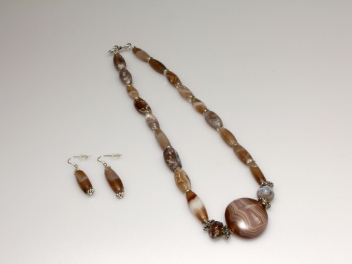 Composed of eighteen elongated biconical banded agate beads, two spherical beads, and a central disk pendant interspersed with modern silver disk-shaped spacer beads and an S-shaped clasp, length is end-to-end, with a matching pair of earrings composed of an elongated biconical banded agate bead, mounted in a modern silver setting.