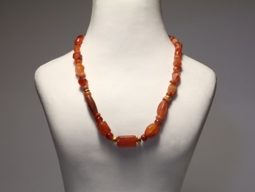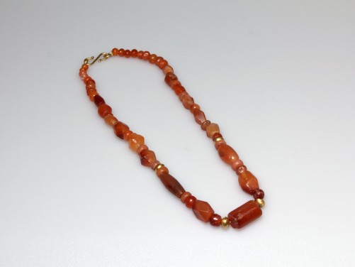 Composed of various shaped carnelian beads, graduated in size, with four modern gold spacer beads and an S-shaped clasp. length is end-to-end