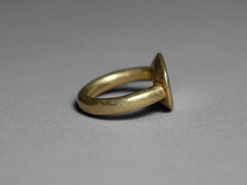 The ring is of 'cartouche' type, named for the shape of the bezel, copying Egyptian versions that have the same thick, cylindrical hoops and bezels engraved with names in hieroglyphs. The solid circular hoop joins to the underside of the bezel. The bezel is engraved in globolo style with stylized rays.