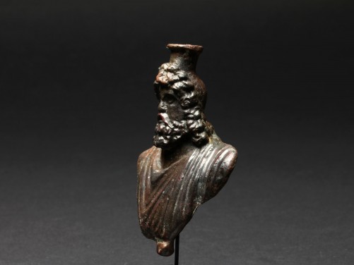The god wearing a chiton and himation over left shoulder, surmounted by the modius headdress, the face framed with luxuriant full beard and thick long wavy hair falling in curls at his back.