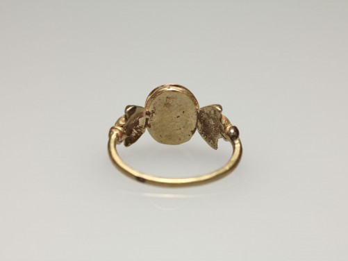 The ancient electrum finger ring set with a plain steatite scaraboid, the ring decorated with a wire hoop and ringlets on either shoulder. Possibly Phoenician. Weight: 2.2g