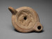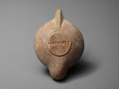 Brown clay with red slip, the concave disc decorated with a lion to the left attacking crocodile from behind, with twin concentric circles and a filling hole, a ring handle with rounded nozzle. The base incised with the potter’s signature MNOVISI.