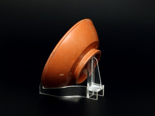Probably from Eastern Gaul, a typical example of the plain Roman redware pottery with lustre surface slip, the round bowl with flaring sides on a ring base, the underside with traces of five finger tips, the raised and pointed tondo stamped with potter’s mark ALBILLI (for Albillus).