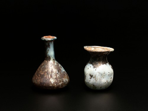 Pale blue colored glass with metallic iridescence, the small squat-shaped flask with near flat underside, the cylindrical neck with rim folded outward, together with a light purplish metallic glass beaker, with the sides indented and outsplayed rim. (2)